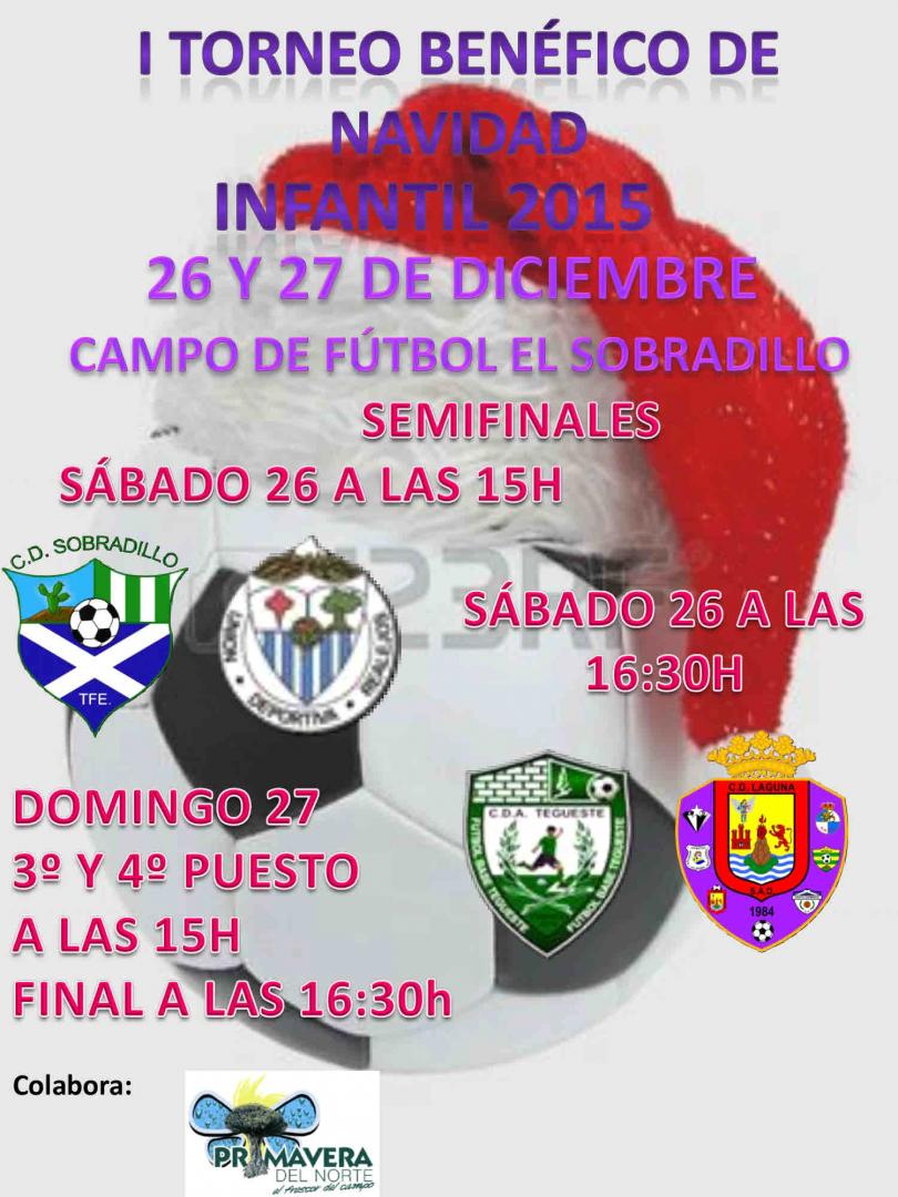 En el dia de hoy queda inaugurado el I Torneo Benéfico de Navidad 2015, con la presencia del presidente del Club Deportivo Sobradillo, Don Manuel de los Reyes Cabello Jara y el gerente de la empresa promotora del evento Primavera del Norte, Don Francisco Fuentes y más directivos. El evento tendrá lugar los días 26 y 27 de diciembre de estas fechas navideñas, les invitamos a asistir a este espectáculo deportivo. El torneo lo disputaran los juveniles de la liga canaria, con la participación de la UD Las Palmas, CD Laguna, CD Ofra y el anfitrión, el CD Sobradillo. Habrá preliminares de la categoría Infantil y Benjamín del futbol base de la isla de Tenerife. Queremos agradecer la colaboración desinteresada de los clubes participantes. Con todo esto el CD Sobradillo les desea una Feliz Navidad y Prospero año nuevo 2016. Un cordial Saludo #DeporteVidaSana!! #SomosCDS!!.